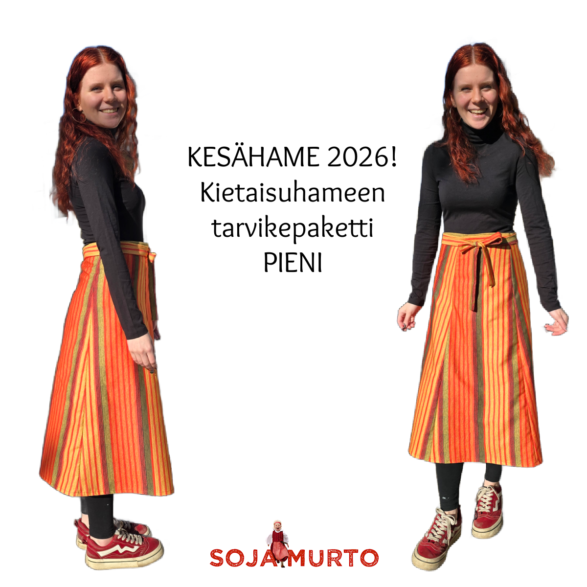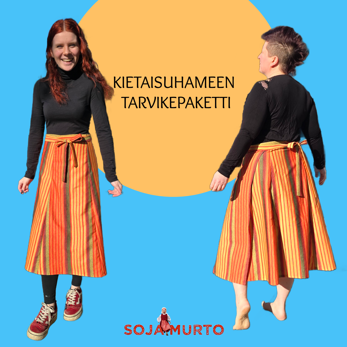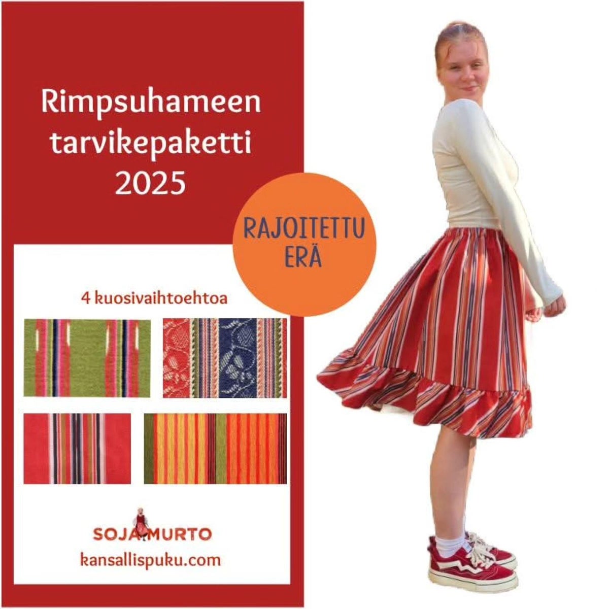 Kansallispukuraidat-puuvillasatiinista ommeltavan kietaisuhameen tarvikepaketti. Sisältää valmiiksi leikatut kangaskappaleet ja tukikankaan vyötärökaitaleeseen.