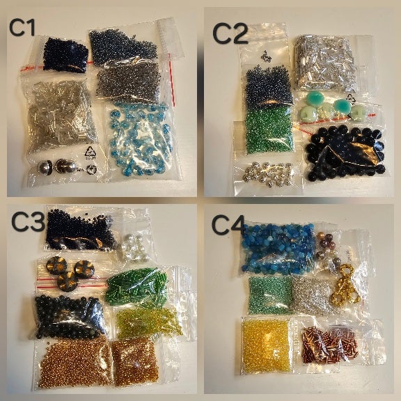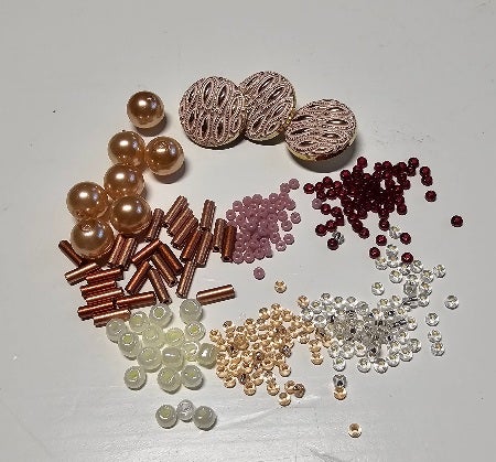 Huolella valitut helmipaketit riittävät yhden nisantakaisen koristeluun. Voi sisältää nappeja. Helmet voivat olla jokihelmiä, korukiveä tai lasia. Lisäksi tarvitset kangasta (n.8 x 20 cm pala), tueksi napakkaa pvl- tai pellavakangasta 2-3 kpl (8 x 20cm paloja), kestävää ompelulankaa (esim. polyesterinen ompelulanka 2-kertaisena), paksuhkoa puuvillalankaa ja ompeluun pitkä helmineula.